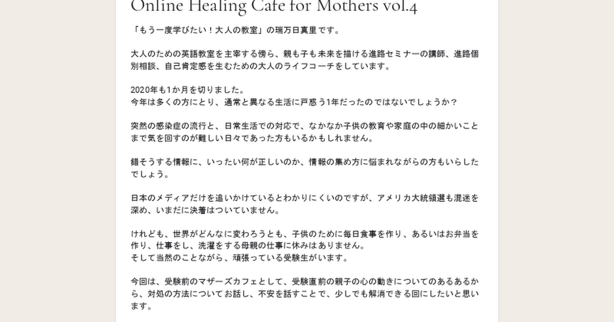 「もう一度学びたい!大人の教室」の瑞万日真里です。大人のための英語教室を主宰する傍ら、親も子も未来を描ける進路セミナーの講師、進路個別相談、自己肯定感を生むための大人のライフコーチをしています。2020年も1か月を切りました。今年は多くの方...